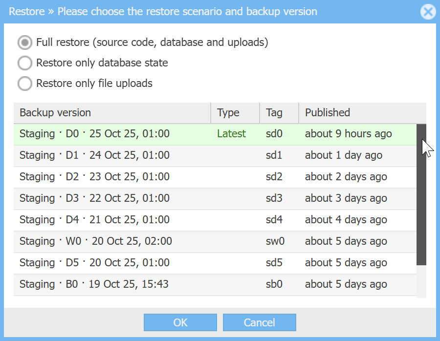 This can be useful in cases when there are no differences in source code and/or file uploads between your current instance and the version from which you want to restore, or there are differences but they’re not meaningful for you at the moment.