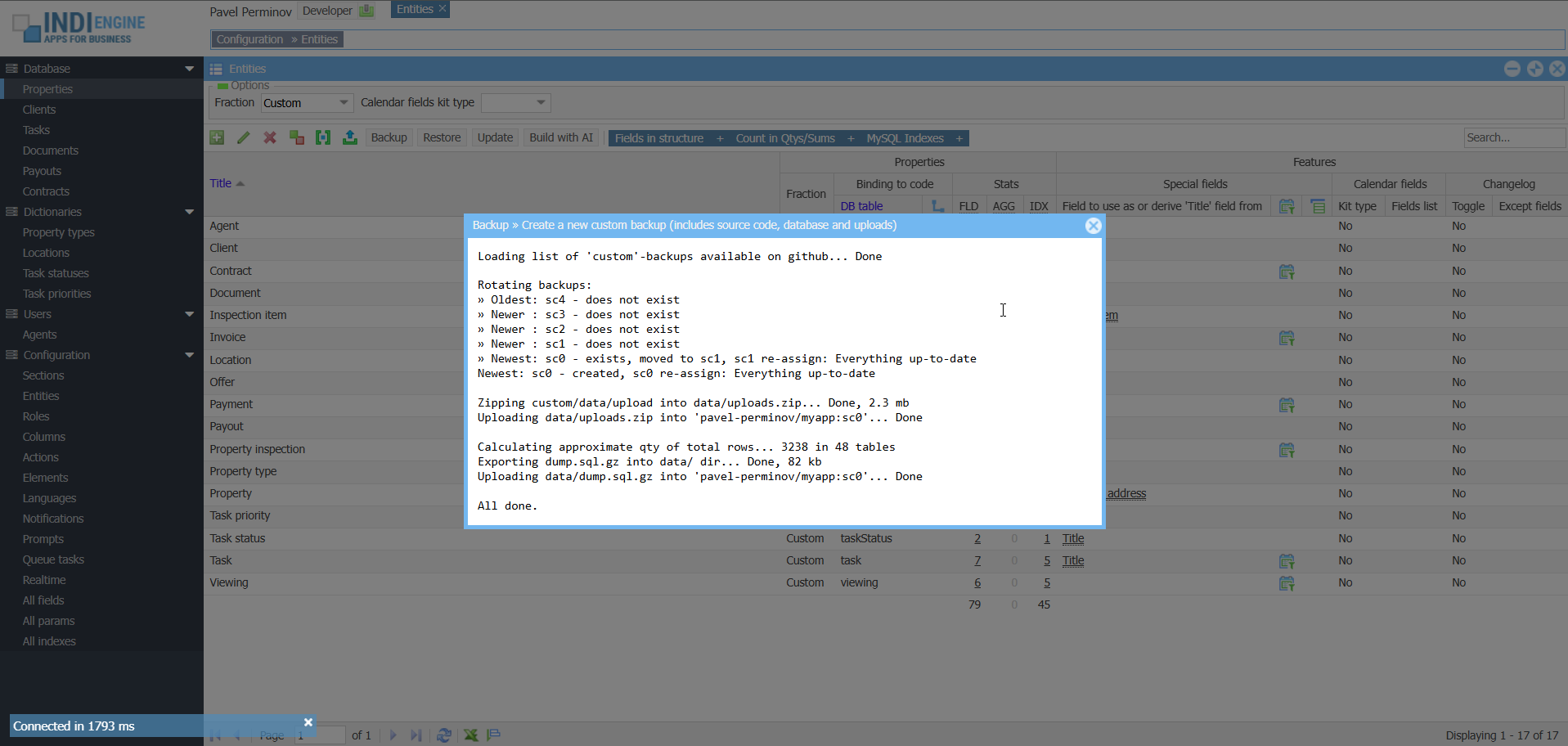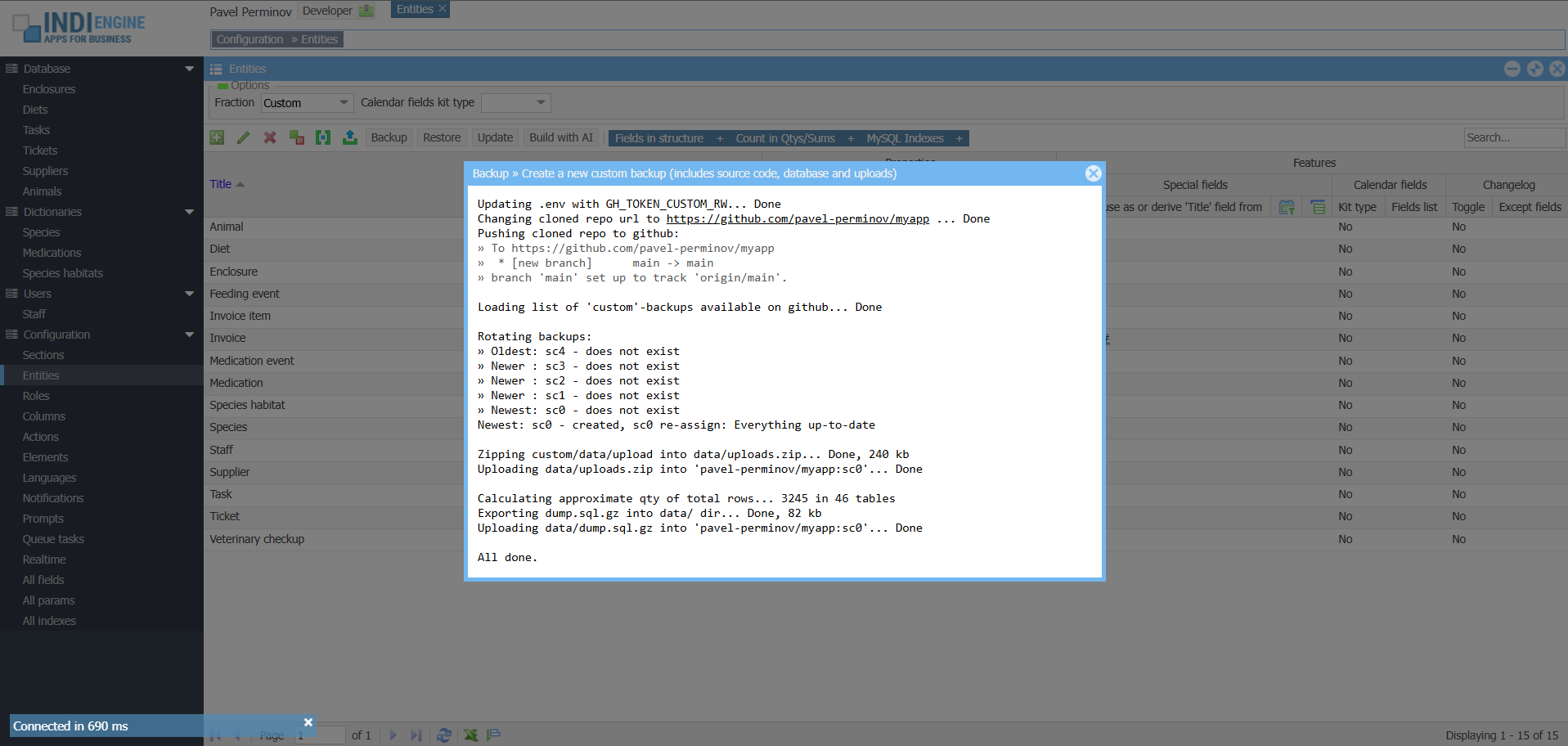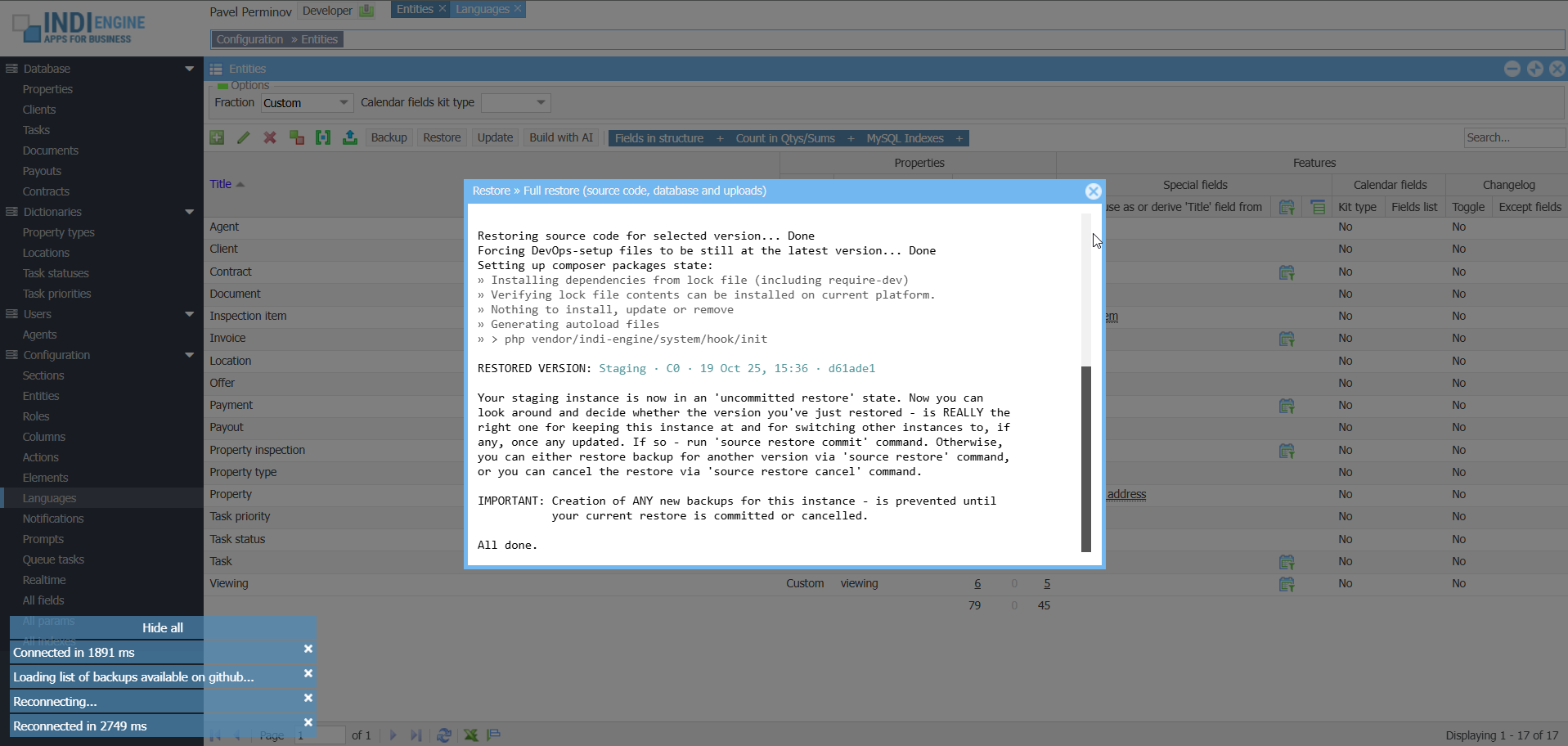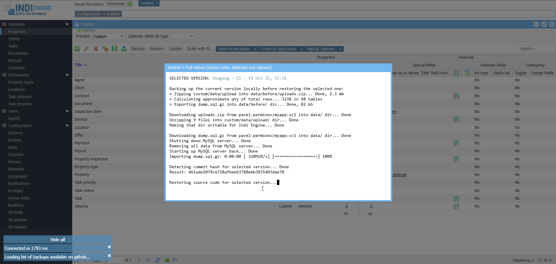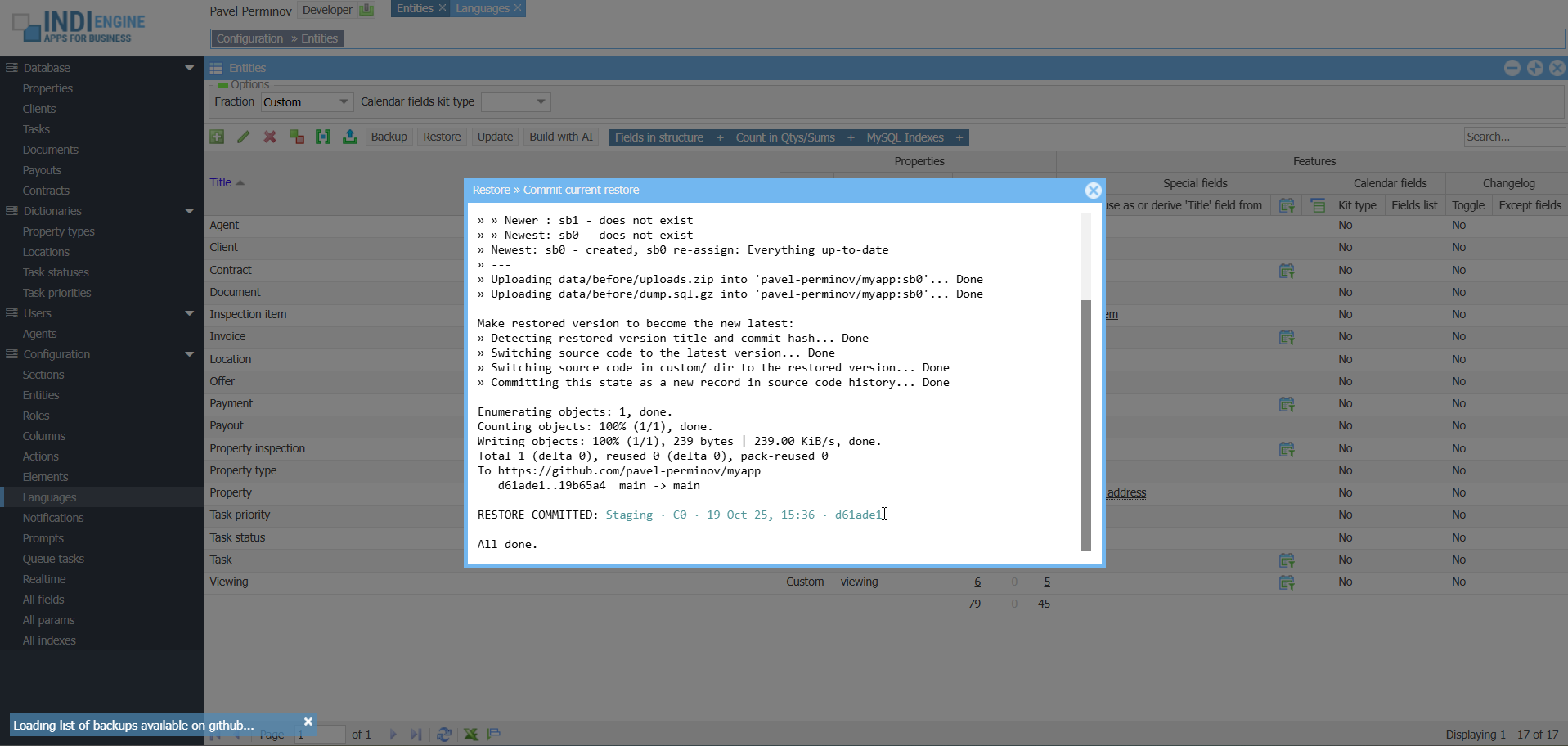 Another two restore scenarios, supported by Indi Engine – allows you to patch you Indi Engine app instance with only the database state or only the file uploads from a backup you choose among the ones already existing on GitHub, so everything else in your instance will remain intact, and for sure your instance will not enter into an ‘uncommitted restore’ state as it’s only applicable to full restore scenario.