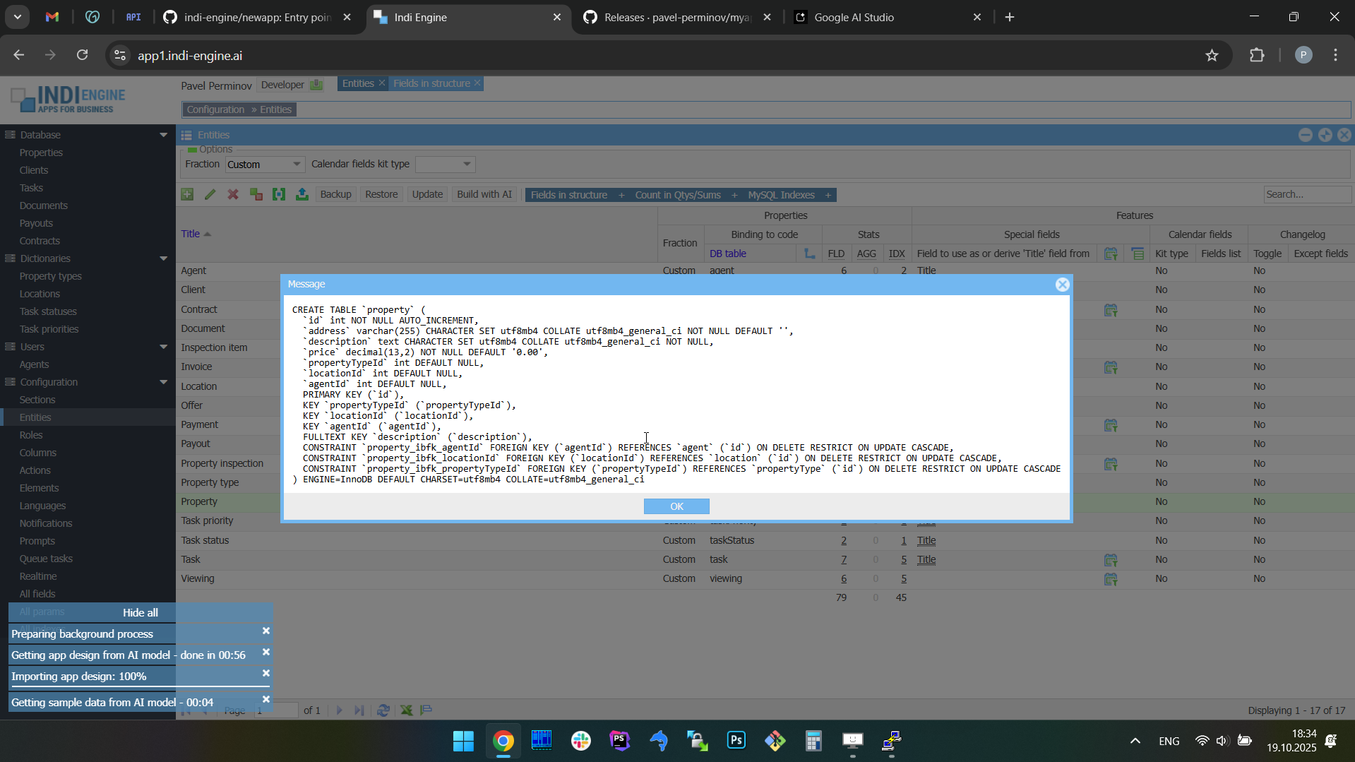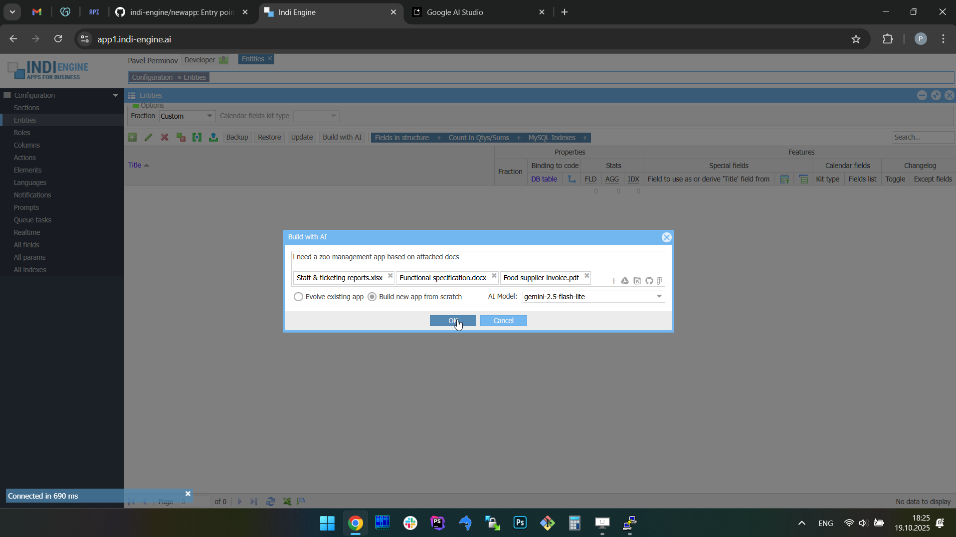 As previously mentioned, when you submit a prompt to the AI model via Build with AI-dialog, under the hood Indi Engine makes two requests to the AI model — first for getting app design, and second for getting sample data.