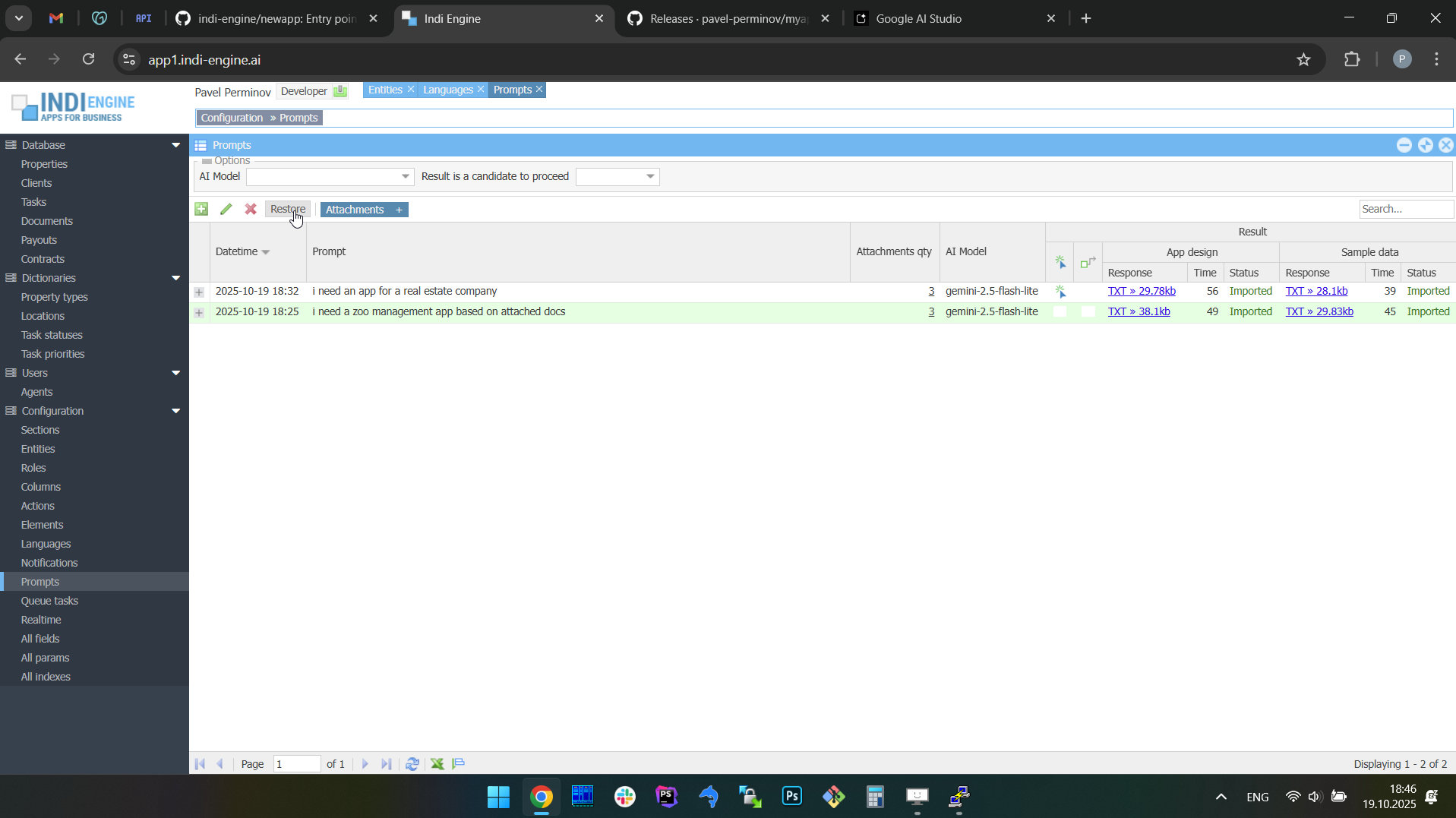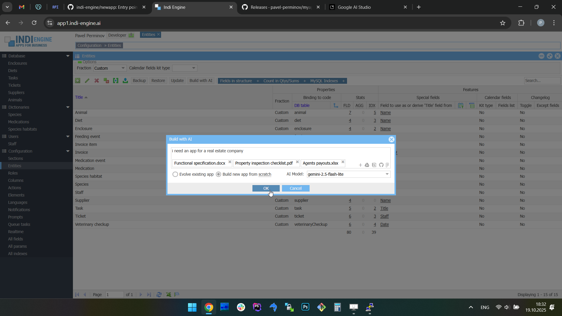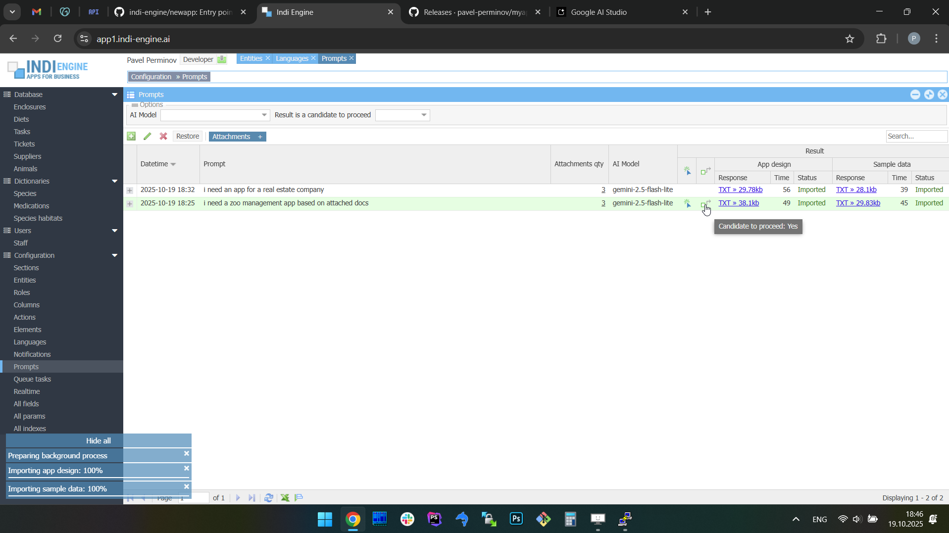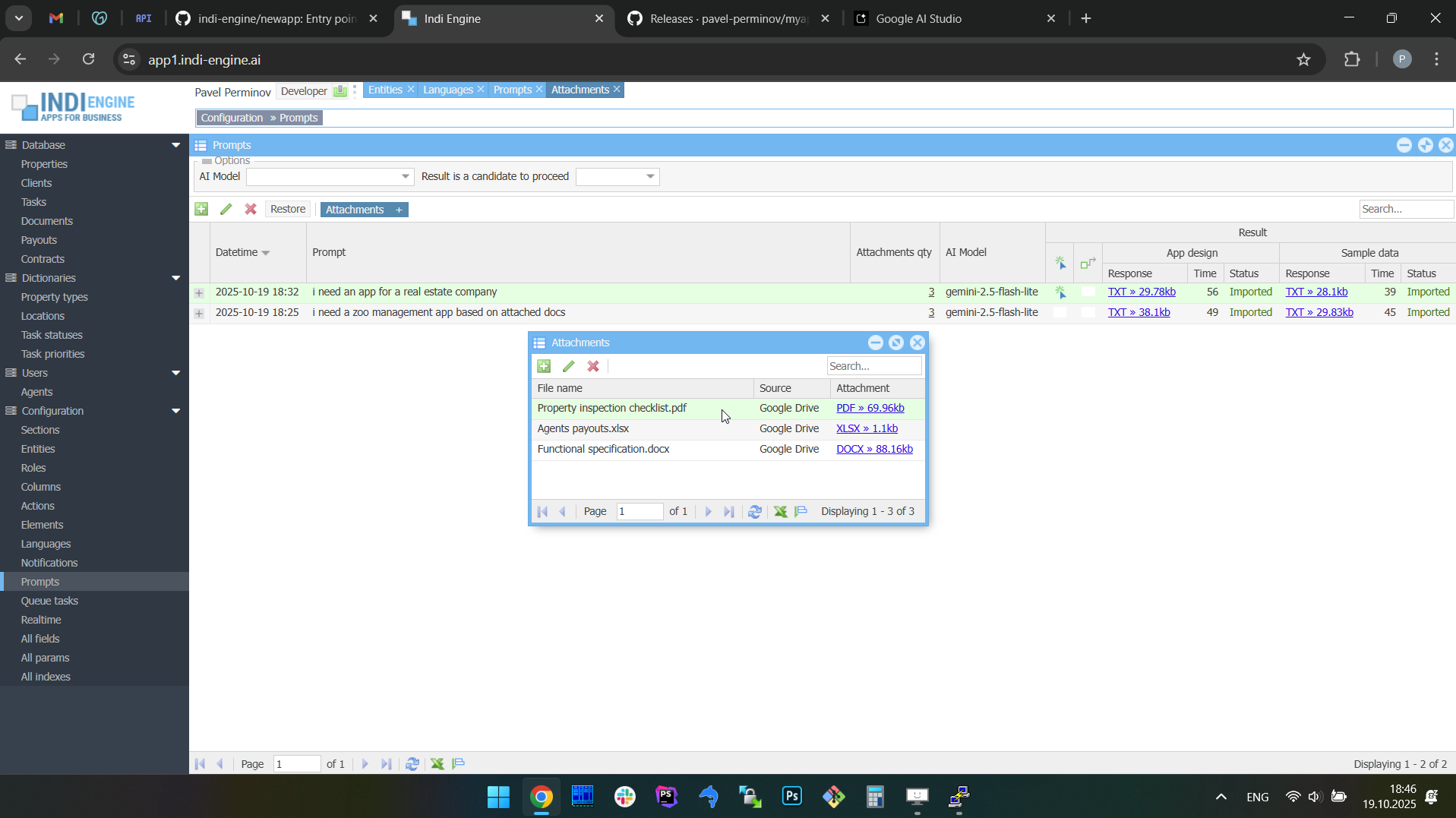 Indi Engine's AI prompt-to-app feature allows you to build an entire database app from just a few plain text sentences and attached files (optionally), so the system generates a database schema relevant for your prompt along with the realtime data-views on top, organized into a foreign-key based hierarchies preloaded with sample data to showcase the resulting app in a natural way — all in minutes.