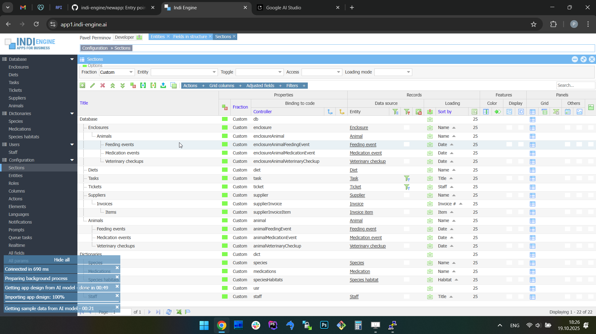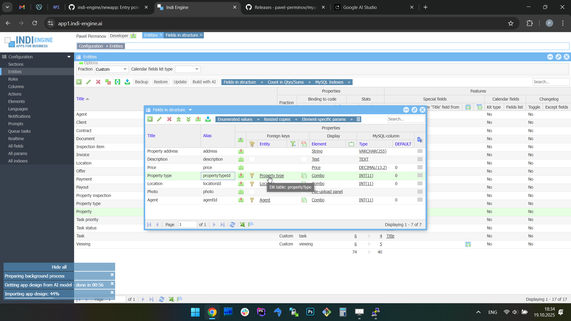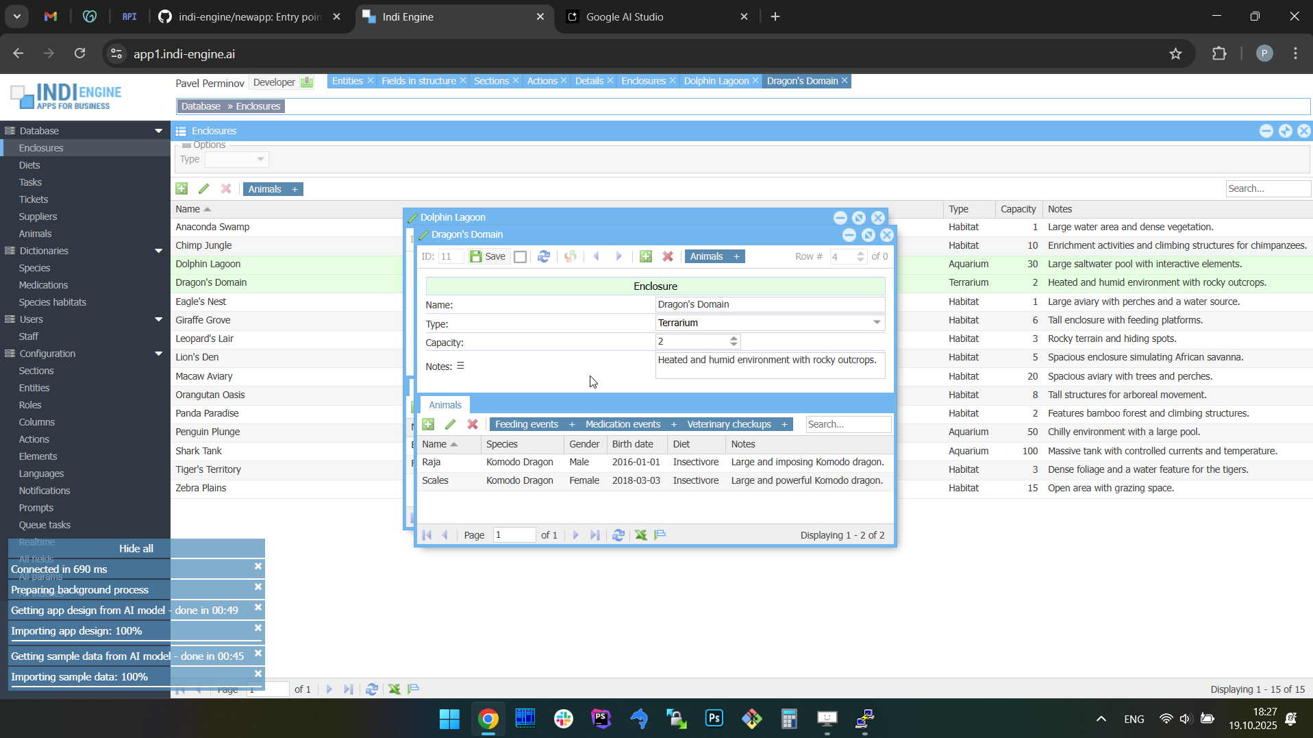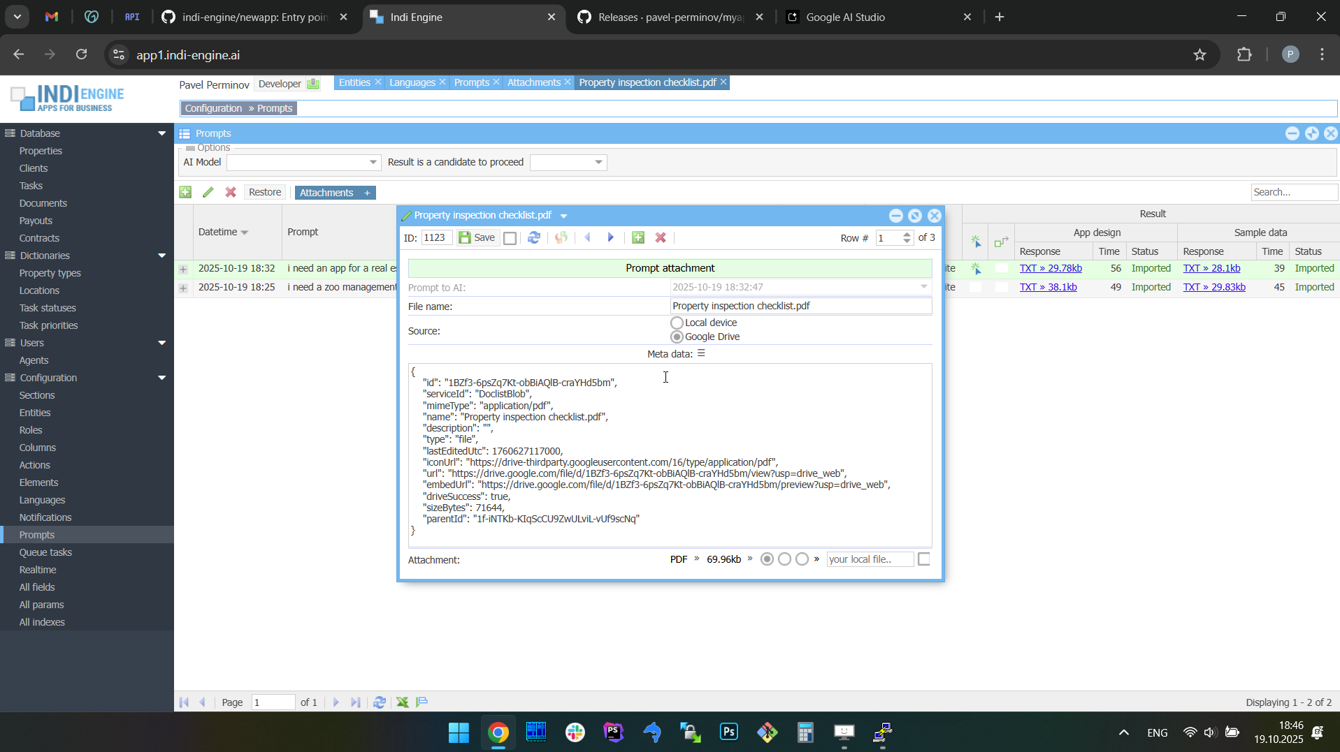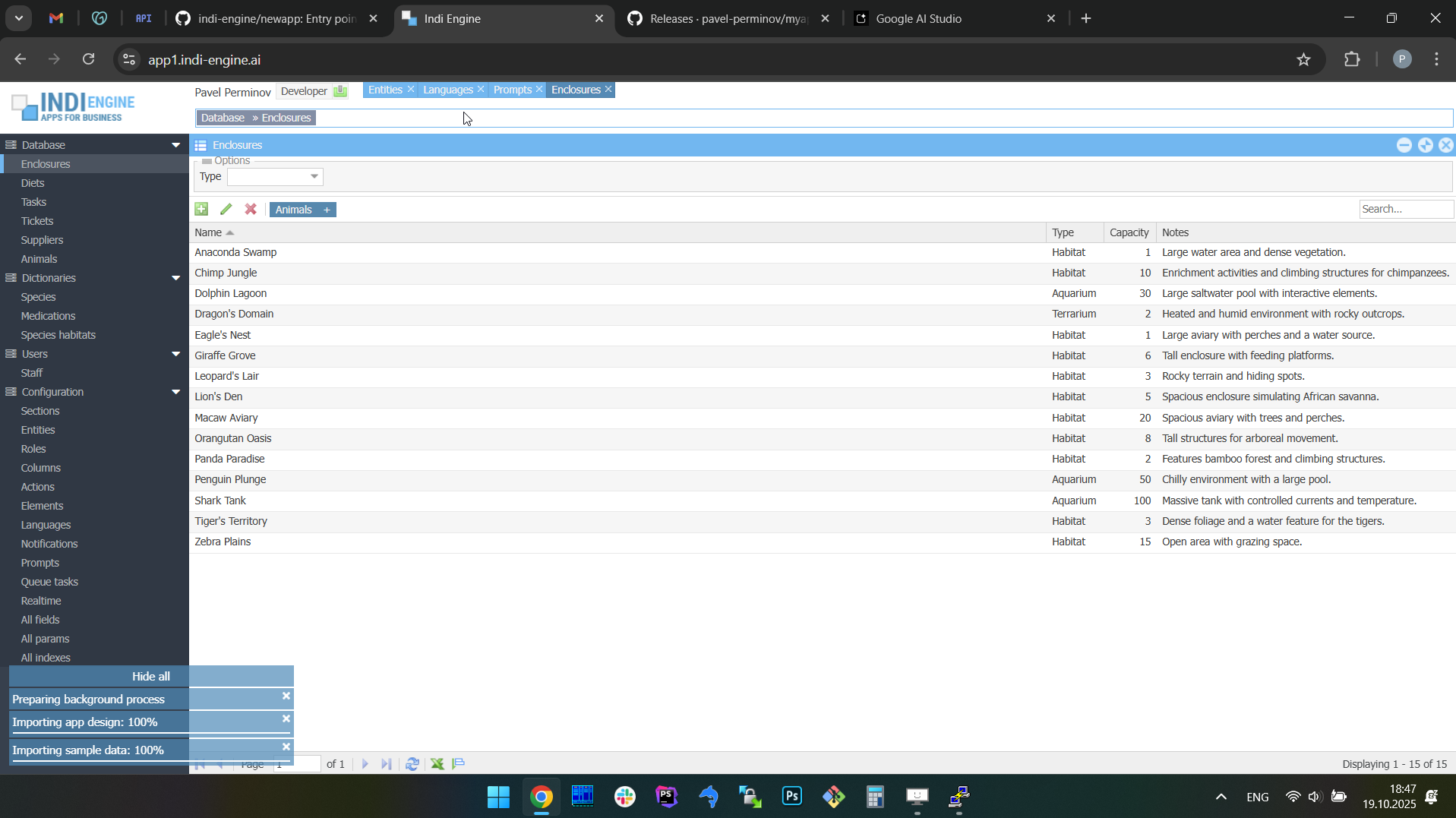 Indi Engine's AI prompt-to-app feature allows you to build an entire database app from just a few plain text sentences and attached files (optionally), so the system generates a database schema relevant for your prompt along with the realtime data-views on top, organized into a foreign-key based hierarchies preloaded with sample data to showcase the resulting app in a natural way — all in minutes.