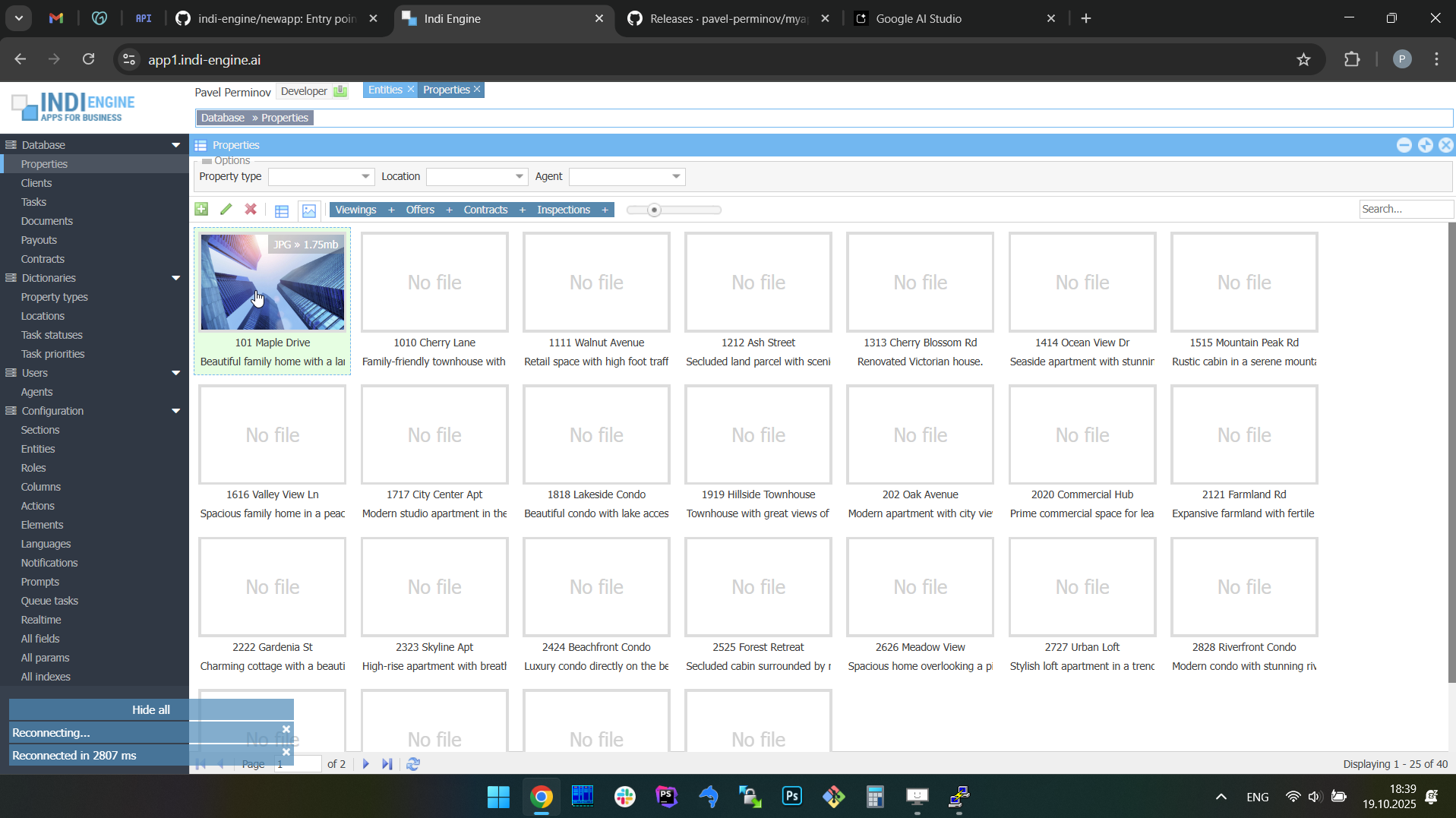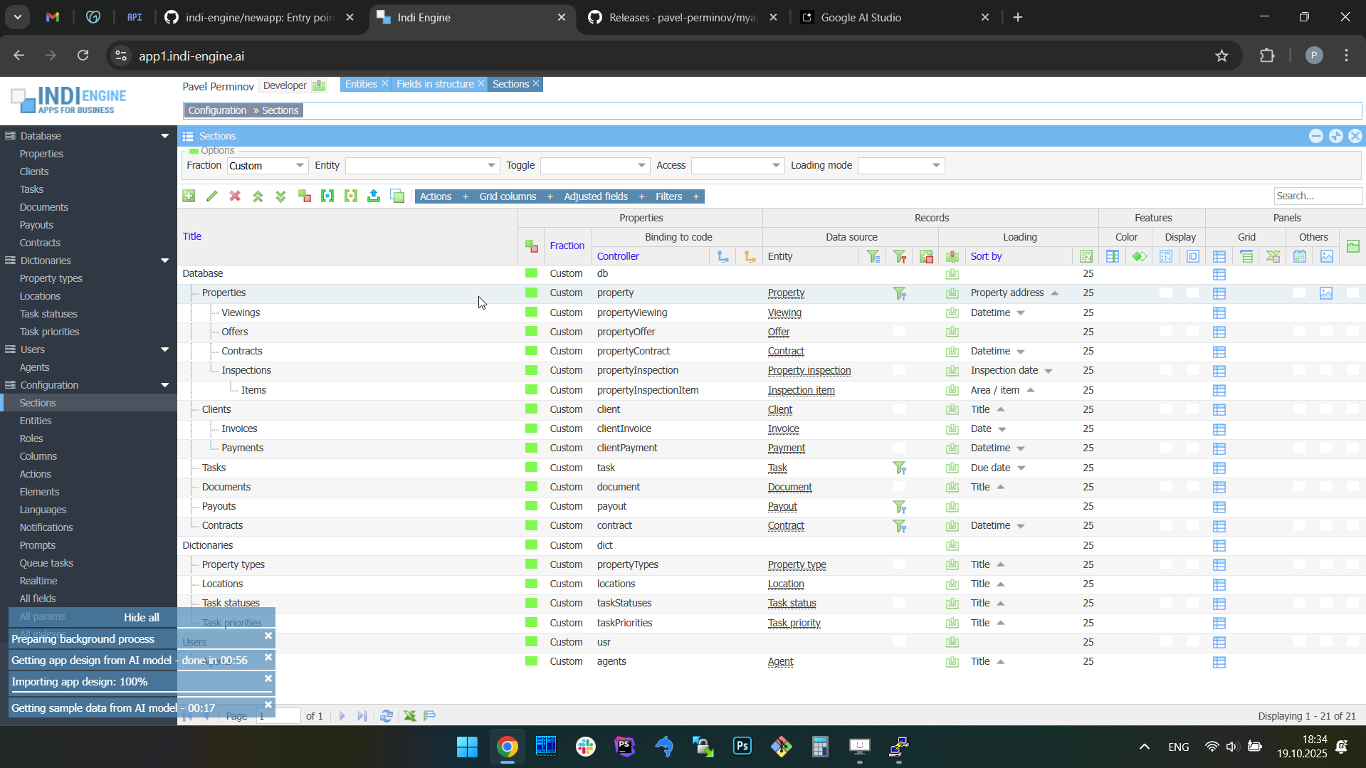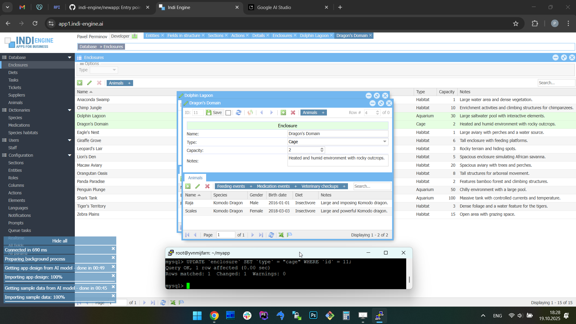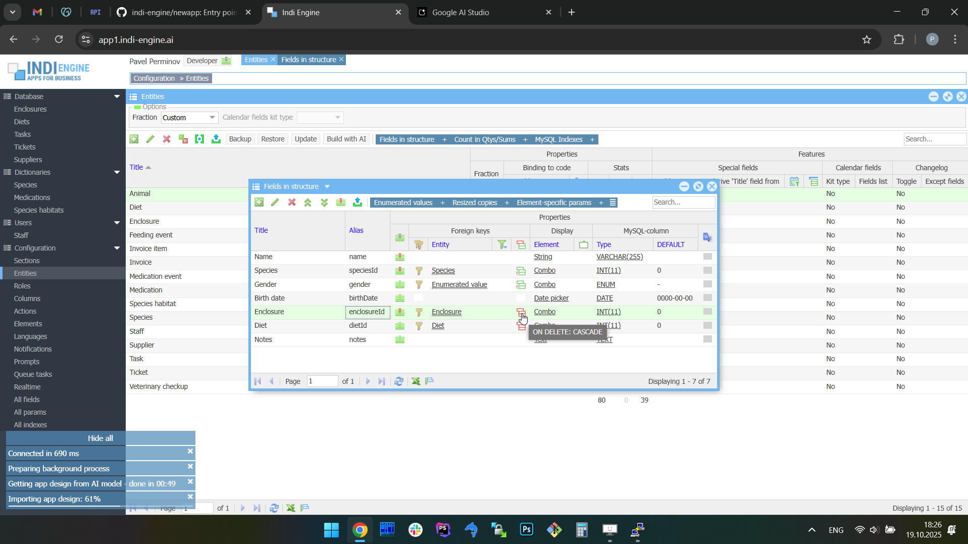 Indi Engine's AI prompt-to-app feature allows you to build an entire database app from just a few plain text sentences and attached files (optionally), so the system generates a database schema relevant for your prompt along with the realtime data-views on top, organized into a foreign-key based hierarchies preloaded with sample data to showcase the resulting app in a natural way — all in minutes.