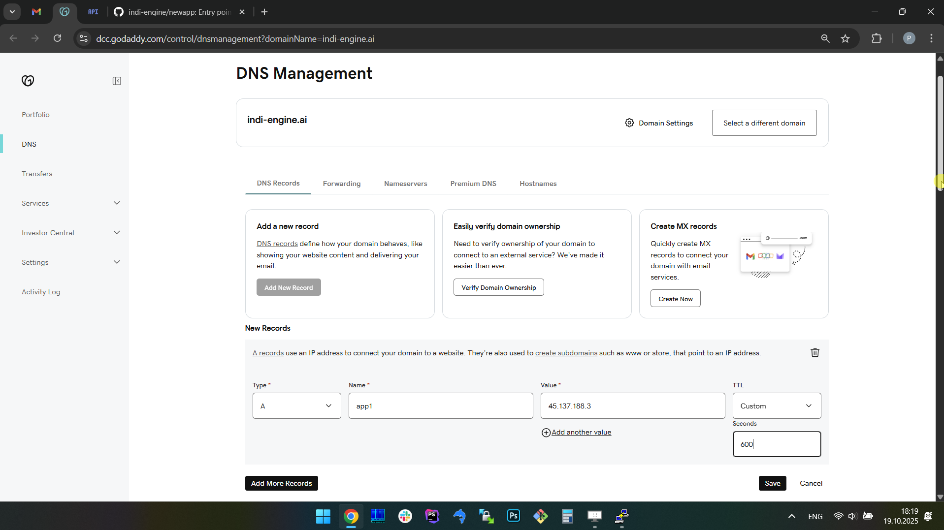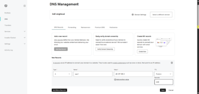1. You should set up at least one domain name for the EMAIL_SENDER_DOMAIN variable in your .env file, located in the root of your Indi Engine app directory at your VPS host filesystem. If you've set that up after you got your Indi Engine app instance app and running - you'll have to recreate the containers using source restart 3 command on the Bash CLI